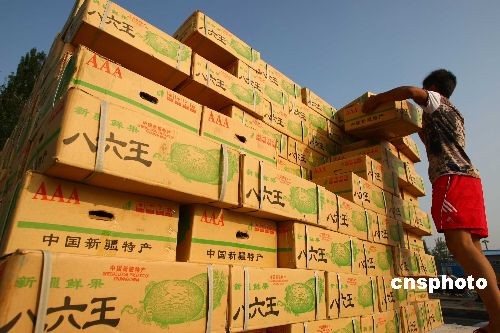 7月24日,新疆特產(chǎn)哈密瓜在北京新發(fā)地農(nóng)貿(mào)市場熱銷。時至盛夏,新疆的各色水果正陸續(xù)成熟,在當(dāng)?shù)毓r(nóng)喜迎豐收的同時,相關(guān)政府部門采取措施幫助他們打開銷路。7月21日,國家商務(wù)部和新疆維吾爾自治區(qū)政府在烏魯木齊組織召開“新疆農(nóng)產(chǎn)品產(chǎn)銷對接洽談會”,來自廣東、北京等地的19家大型農(nóng)產(chǎn)品批發(fā)零售企業(yè)與當(dāng)?shù)毓⿷?yīng)商及生產(chǎn)基地簽訂近40萬噸的采購協(xié)議。中新社發(fā) 富田 攝