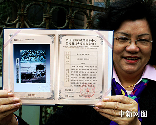 在2009年12月底,這幅畫送權威機構北京中博文物檢測鑒定中心鑒定,經(jīng)資深文物鑒定專家陳行一先生鑒定,確認為徐悲鴻大師的真跡。陳行一在鑒定意見中還寫道:“劉夫人亦屬豬,是圖繪一家子豬,肥肥胖胖,相依相偎,富貴滿堂。形體結(jié)構、透視比例準確,水墨淡色十分到位,形態(tài)逼真。背景敷以湖蕩水草,筆觸簡練,不愧為大師之作。畫家作豬十分罕見,彌足珍貴。”