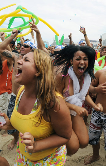 北京時(shí)間10月3日凌晨結(jié)束的2016年夏季奧運(yùn)會(huì)舉辦城市投票中,巴西里約熱內(nèi)盧經(jīng)過三輪投票,擊敗馬德里、東京和芝加哥,成功獲得了2016年奧運(yùn)會(huì)的主辦權(quán)。這將是現(xiàn)代奧林匹克運(yùn)動(dòng)自1894年首次在希臘舉辦之后,在一百多年的時(shí)間里首次來(lái)到南美洲大陸。圖為巴西民眾得知里約熱內(nèi)盧獲得2016年奧運(yùn)會(huì)主辦權(quán)后,在海灘上瘋狂歡慶。