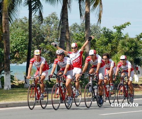 來自二十四個國家和地區(qū)的十八支參賽隊伍、一百零六名自行車手已于十一月二日全部抵達(dá)海南三亞。上午九時許,各隊選手開始熱身,為明天開始的海馬汽車二00七環(huán)海南島國際公路自行車賽做準(zhǔn)備。中新社發(fā) 彭小云 攝