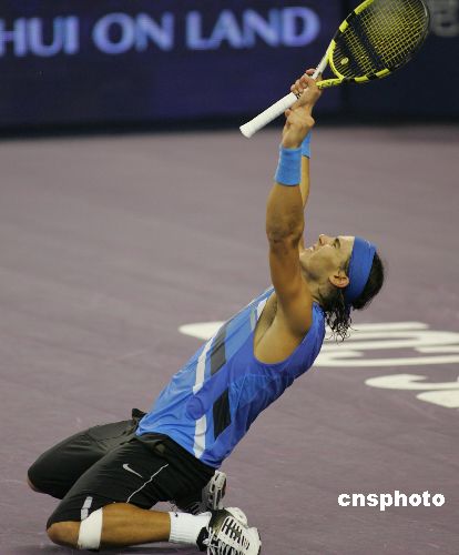 11月15日,在2007年上海大師杯單打金組納達爾對陣德約科維奇的比賽中,世界二號選手納達爾以2比0(6比4,6比4)輕取對手。最終,納達爾在小組賽中以兩勝一負的戰(zhàn)績挺進本屆大師杯四強。中新社發(fā) 湯彥俊 攝