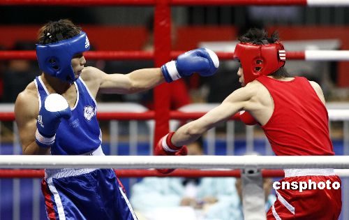 十一月十八日晚,“好運(yùn)北京”2007年國(guó)際拳擊邀請(qǐng)賽在北京工人體育館進(jìn)行預(yù)賽第三階段的比賽,在男子五十七公斤級(jí)的比賽中,中國(guó)香港選手曹聲揚(yáng)(紅色)在比賽中進(jìn)攻雖猛仍不敵中華臺(tái)北選手鐘俊安(藍(lán)色)。本次邀請(qǐng)賽有來(lái)自十七個(gè)國(guó)家和地區(qū)的十八支隊(duì)伍參加,采用單敗淘汰制方式,進(jìn)行預(yù)賽、半決賽、決賽共七十場(chǎng)比賽,比賽時(shí)間為十一月十七日至二十二日。中新社發(fā) 盛佳鵬 攝