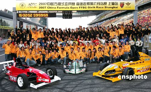 11月24-25日,由香港嘉信控股集團旗下的三大騰飛(北京)方程式運動有限公司承辦的2007年中國方程式公開賽收官賽在上海國際賽車場舉行,比賽包括威速方程式系列賽和雷諾2000組賽,選手皆為日本、阿根廷、芬蘭、香港及中國國內最具實力的車手。圖為全體車手和賽事服務人員大合照。中新社發(fā) 趙振清 攝