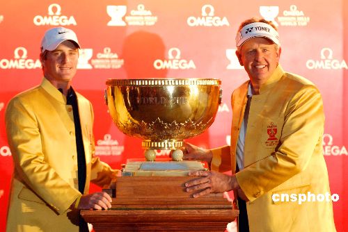 蘇格蘭隊選手科林.蒙哥瑪利(右)/馬克.沃倫十一月二十五日經(jīng)過四輪鏖戰(zhàn)以負(fù)二十五桿的總成績奪得在深圳舉辦的歐米茄觀瀾湖高爾夫世界杯冠軍。中新社發(fā) 陳文 攝