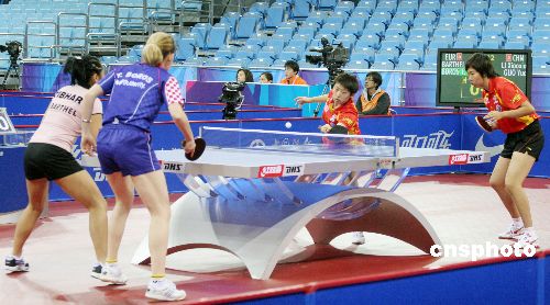 12月18日,奧運(yùn)測(cè)試賽乒乓球女團(tuán)比賽揭幕。第三場(chǎng)進(jìn)行的是雙打比賽,中國(guó)隊(duì)派出郭躍/李曉霞這對(duì)雙打組合,而歐洲聯(lián)隊(duì)一方則是鮑羅斯和孫禎琦的組合,雖然首局在拿到局點(diǎn)的情況下被對(duì)手以12比10逆轉(zhuǎn),但郭躍和李曉霞調(diào)整心態(tài)的速度非?欤齻円11比7,11比5和11比2連下三局,以3比1戰(zhàn)勝鮑羅斯/孫禎琦,從而使得中國(guó)女隊(duì)以3比0輕取歐洲聯(lián)隊(duì),取得本次邀請(qǐng)賽的開(kāi)門(mén)紅。中新社發(fā) 博芽影像 攝