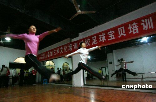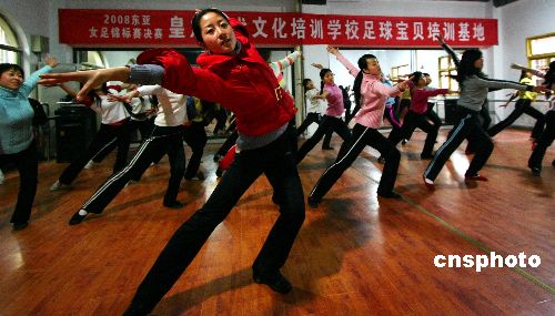 1月15日,東亞女足的“足球?qū)氊悺眰冊(cè)谟?xùn)練。2008年?yáng)|亞女足錦標(biāo)賽將于2月17日-24日在重慶市永川區(qū)體育中心舉行,永川區(qū)從該區(qū)大中院校選出42名“足球?qū)氊悺,進(jìn)行為期一個(gè)月的藝術(shù)體操、姿態(tài)等基本功訓(xùn)練,屆時(shí)將以嶄新身姿展現(xiàn)在人們面前。中新社發(fā) 陳仕川 攝
