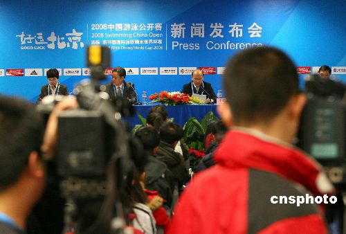 1月29日,在“水立方”召開的中國(guó)游泳公開賽新聞發(fā)布會(huì),吸引各國(guó)媒體爭(zhēng)相報(bào)道。中國(guó)游泳公開賽是在國(guó)家游泳中心——水立方舉行的首場(chǎng)比賽。中新社發(fā) 富田 攝