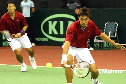 2月9日,2008年戴維斯杯亞大區(qū)II組中國(guó)隊(duì)vs黎巴嫩隊(duì)比賽在北京國(guó)際網(wǎng)球中心進(jìn)行了第三場(chǎng)雙打比賽的較量。于欣源/曾少昡 以6:2,7:6(4),6:2戰(zhàn)勝黎巴嫩的吉桑·扎阿蒂尼/帕蒂克·楚克里雙打組合。盡管后兩場(chǎng)單打還沒進(jìn)行,中國(guó)隊(duì)總比分3:0已經(jīng)確保勝利晉級(jí)下輪。中新社發(fā) 富田 攝