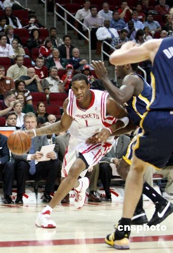 當(dāng)?shù)貢r(shí)間3月5日晚,休斯敦火箭隊(duì)坐鎮(zhèn)主場,在缺少姚明的情況下,以117比99大勝印地安那步行者隊(duì)豪取16連勝,刷新了球隊(duì)41年歷史上的最長連勝紀(jì)錄。圖為火箭靈魂人物麥迪帶球突破。中新社發(fā) 楊晉升 攝