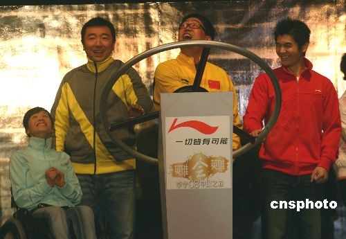 3月22日,“李寧零八中國之旅”活動在北京朝陽公園啟動,該活動將通過“大篷車”巡游的形式,歷時9個月,行程4萬公里,途經(jīng)全國近百座中型城市宣傳奧運(yùn)精神、大屏幕直播北京奧運(yùn)會比賽,并開展三加一籃球挑戰(zhàn)賽等一系列全民健身活動。 圖為前中國體操隊選手桑蘭(左一)、奧運(yùn)冠軍楊凌(左二)、邢傲偉(左四)等在啟動儀式上。中新社發(fā) 沈晨 攝