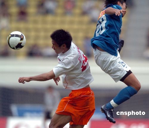 2008年4月6日下午,新賽季中超進(jìn)入第二輪角逐。被譽為廣東“德比”的深圳上清飲隊在主場深圳體育場迎戰(zhàn)本賽季的升班馬廣藥中一隊。經(jīng)過90分鐘鏖戰(zhàn)雙方以1比1握手言和。中新社發(fā) 吳峻 攝