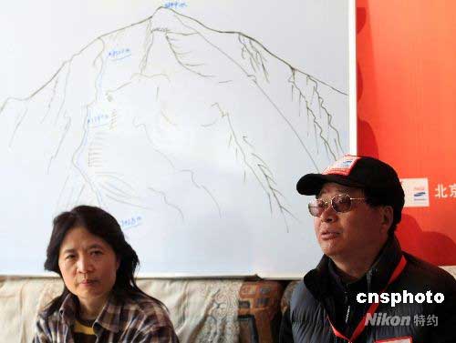 5月7日,在經(jīng)歷了一場大雪后,珠峰地區(qū)已經(jīng)連續(xù)3天晴好。中國登山隊(duì)發(fā)言人張志堅(jiān)(右)在珠峰大本營絨布新聞中心詳解了登珠峰路線圖,并指出沿途有三大難點(diǎn)。他還指出,對這個(gè)路線,可以說是“輕車熟路,但是有一定困難”。中新社發(fā) 盛佳鵬 攝