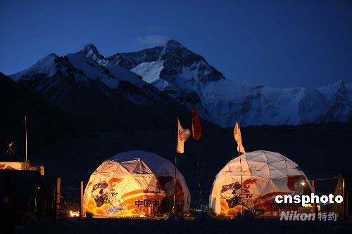 圖:圣火登珠峰 珠峰大本營燈火通明