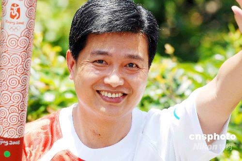 5月8日中午,奧運(yùn)火炬接力傳遞在深圳舉行,社會各界208名火炬手穿越深圳。圖為深圳第一位打破世界紀(jì)錄的運(yùn)動員韓星元在第四棒火炬?zhèn)鬟f中。中新社發(fā) 陳文 攝