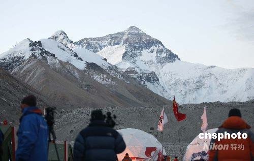 5月8日,北京奧運圣火成功登頂珠穆朗瑪峰。受邀采訪2008北京奧運火炬接力珠峰傳遞的中外媒體一早就趕到珠峰大本營,希望拍攝到中國登山隊員在珠峰的影子。在場的美聯(lián)社、路透社、法新社等眾多國際媒體第一時間報道了圣火登頂?shù)南。中新社發(fā) 盛佳鵬 攝
