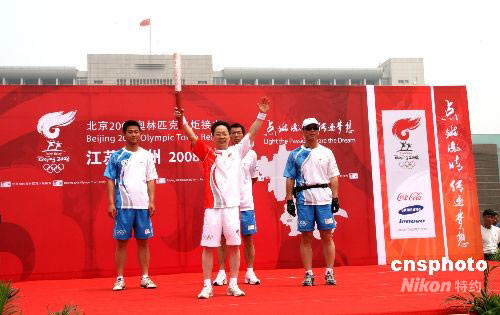 5月26日上午,奧運(yùn)圣火在泰州開(kāi)始傳遞。共有104名火炬手、23名護(hù)跑手在3個(gè)小時(shí)內(nèi)合力跑完12.8公里的傳遞路程。圣火從百年名校江蘇省泰州中學(xué)開(kāi)始出發(fā),途經(jīng)桃園、梅蘭芳紀(jì)念館等地最終到達(dá)泰州市人民廣場(chǎng)。圖為舉重世界冠軍周培順為最后一棒火炬手。中新社發(fā) 崔佳明 攝