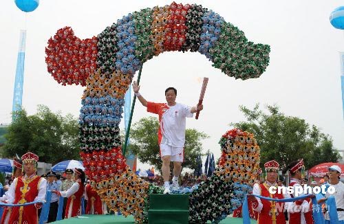 7月10日,奧運(yùn)火炬在內(nèi)蒙古赤峰市進(jìn)行傳遞。火炬手于建設(shè)穿過(guò)用福娃組成的“玉龍”。在赤峰翁牛特旗出土的紅山文化標(biāo)志性文物——玉龍,被史學(xué)界定為“中華第一龍”。中新社發(fā) 廖攀 攝