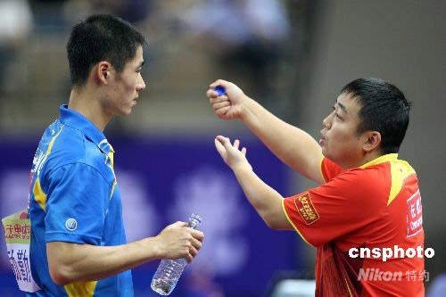 7月29日,中國(guó)乒乓球隊(duì)備戰(zhàn)奧運(yùn)熱身賽在無錫繼續(xù)進(jìn)行,男隊(duì)針對(duì)非奧運(yùn)選手制定獎(jiǎng)勵(lì)機(jī)制,在以王皓、馬琳、王勵(lì)勤3人為擂主的擂臺(tái)賽上,每名非奧運(yùn)選手獲得一場(chǎng)勝利,就將獲得2009年一項(xiàng)國(guó)際公開賽的參賽權(quán);獲得兩場(chǎng)勝利就能獲得2009年世乒賽單項(xiàng)比賽的參賽資格;獲得三場(chǎng)勝利則可以直接獲得2009年世乒賽男單比賽的參賽資格。擂主王勵(lì)勤在比賽中苦戰(zhàn)7局最終4比3完成大逆轉(zhuǎn)戰(zhàn)勝小將徐輝,主教練劉國(guó)梁賽中緊急指導(dǎo)。中新社發(fā) 盛佳鵬 攝