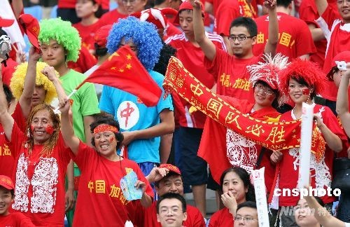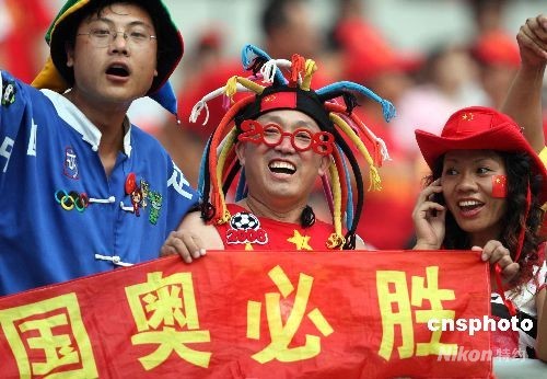 8月7日,北京奧運(yùn)會沈陽足球分賽場男足預(yù)賽,中國隊1:1戰(zhàn)平新西蘭隊。圖為現(xiàn)場狂熱的中國球迷。中新社發(fā) 張宇 攝