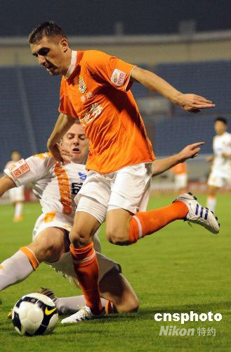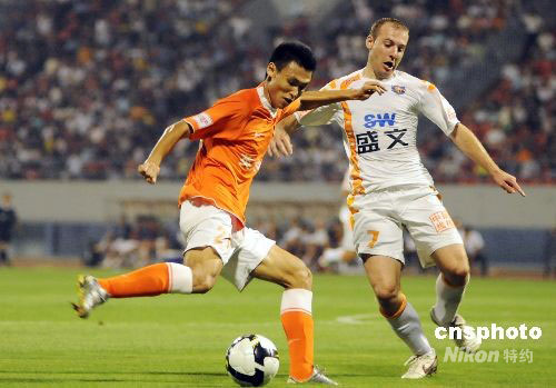 2008年9月7日,中國(guó)足球超級(jí)聯(lián)賽第9輪在山東濟(jì)南的一場(chǎng)比賽,主場(chǎng)作戰(zhàn)的山東魯能泰山隊(duì)以2比1戰(zhàn)勝青島盛文中能隊(duì)。中新社發(fā) 張侃 攝