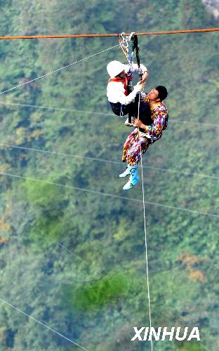 10月18日,新疆“達(dá)瓦孜”傳人賽買提·艾山在湖南張家界市天門山挑戰(zhàn)世界最大坡度高空走鋼絲時(shí)發(fā)生意外,在距終點(diǎn)50米處跌坐在鋼繩上,被迫放棄挑戰(zhàn)。意外發(fā)生后,地面安全人員及時(shí)展開救援,歷時(shí)1小時(shí)16分鐘將懸坐在400米高空鋼繩上的賽買提順利救出。 新華社記者龍弘濤攝
