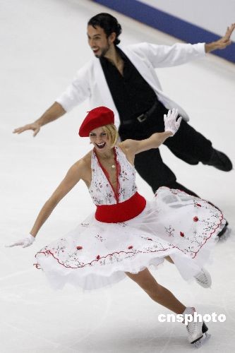 11月7日,2008中國杯世界花樣滑冰大獎賽在北京首都體育館進行第二天的爭奪,美國組合貝爾賓、阿岡斯托在冰舞創(chuàng)編舞比賽中獲第一名,并以95.23分的總成績位列十對參賽選手的第二名,俄羅斯組合多姆尼娜、沙巴林以95.58的成績排在參賽的十對選手之首。中新社發(fā) 盛佳鵬 攝