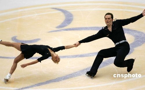 11月7日,2008/09賽季花樣滑冰大獎賽中國站比賽,在北京首都體育館結(jié)束了第二天的爭奪。在壓軸進(jìn)行的雙人自由滑比賽中,中國組合張丹/張昊順利摘得金牌,烏克蘭搭檔沃洛佐扎/莫洛佐夫獲得亞軍,中國另一對選手龐清/佟健排名第三。圖為烏克蘭選手沃洛佐扎/莫洛佐夫在比賽中做托舉動作。中新社發(fā) 富田 攝