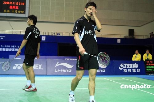 11月21日,在上海進(jìn)行的2008年中國(guó)羽毛球公開(kāi)賽男雙1/4決賽中,中國(guó)頭號(hào)男雙組合蔡赟/傅海峰以1比2不敵跨國(guó)組合陳甲亮/吳俊明無(wú)緣四強(qiáng),三局的比分為17比21、21比19和21比18。中新社發(fā) 湯彥俊 攝