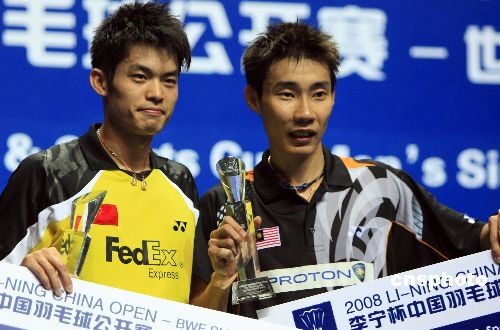11月23日,在上海舉行的2008年中國羽毛球公開賽男子單打決賽中,中國頭號(hào)選手林丹(左)以2比0戰(zhàn)勝馬來西亞選手李宗偉(右),獲得冠軍。這也是他第三次奪得中國羽毛球公開賽的冠軍。中新社發(fā) 湯彥俊 攝