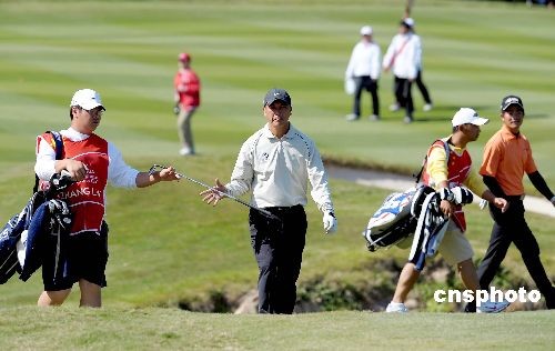 11月29日,歐米茄觀瀾湖世界杯高爾夫比賽進(jìn)入第三天,中國(guó)球手張連偉、梁文沖在第三輪的四人四球賽中發(fā)揮神勇,第三輪打出-8的好成績(jī)。中新社發(fā) 陳文 攝