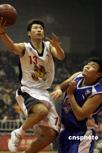 圖為山西中宇隊(duì)員于學(xué)林(白)突破上籃。