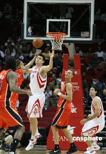 當(dāng)?shù)貢r(shí)間1月31日,姚明領(lǐng)銜的火箭隊(duì)以110比93戰(zhàn)勝勇士擺脫連敗陰影。姚明上場(chǎng)34分鐘14投9中,得到25分11個(gè)籃板。中新社發(fā) 歐文 攝