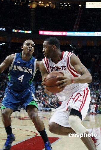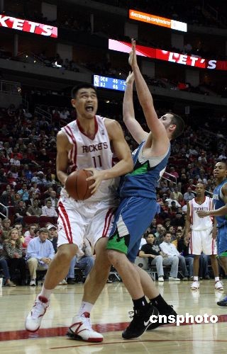 當?shù)貢r間2月7日晚,休斯敦火箭在主場豐田中心迎戰(zhàn)西北賽區(qū)倒數(shù)第二的森林狼隊。結果火箭在上半場一度落后兩位數(shù),但憑借姚明和阿爾斯通等人在下半場的出色發(fā)揮,火箭最終以107-90擊敗森林狼避免了尷尬的連敗。姚明全場18次投籃12次命中,得到火箭最高的30分6個籃板5次蓋帽。中新社發(fā) 歐文 攝