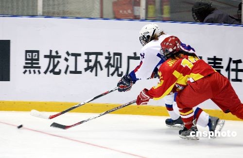 2月18日,第24屆國際大學生冬季運動會在哈爾濱冰球館拉開戰(zhàn)幕。當日大冬會女子冰球比賽將在哈爾濱冰球館進行3場比賽,首場斯洛伐克隊(白)對中國隊(紅),比賽進行到10時20分中國隊進首球。中新社發(fā) 姚庭山 攝