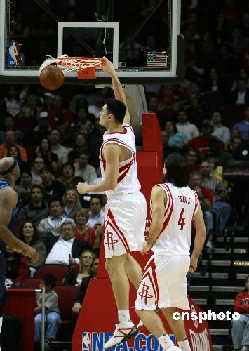 當(dāng)?shù)貢r間二月二十日晚,NBA火箭隊在休斯頓主場迎戰(zhàn)小牛隊,以93比86逆轉(zhuǎn)獲勝。中國球員姚明拿下了22分13個籃板。圖為姚明扣籃得分。中新社發(fā) 歐文 攝