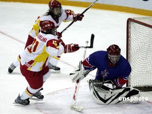 2月24日,第二十四屆世界大學(xué)生冬季運(yùn)動(dòng)會(huì)女子冰球小組賽最后一輪的比賽在哈爾濱冰球館結(jié)束,在晚間結(jié)束的比賽中,中國(guó)隊(duì)以8比0大勝英國(guó)。這樣中國(guó)女冰就以小組第二的身份晉級(jí)半決賽,在半決賽中她們將面對(duì)小組第三的芬蘭。圖為中國(guó)隊(duì)(白)破門得分。中新社發(fā) 富田 攝