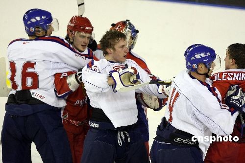 2月25日晚最后一場男子冰球小組賽由俄羅斯對陣斯洛伐克,整場比賽火爆激烈,最終俄羅斯隊9:3取勝,保持小組不敗進入半決賽。中新社發(fā) 王韶驊 攝