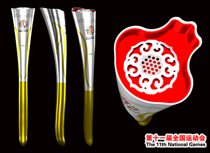 十一運(yùn)會(huì)火炬“如意”緊緊圍繞“和諧中國(guó)、全民全運(yùn)”的主題,外形由中國(guó)傳統(tǒng)吉祥物件“如意”演變而來(lái),取“如意和諧,吉祥美好”之寓意;鹁嬲w由金銀兩色組成,出火口借鑒元代青花瓷荷花紋飾,殼體采用漢代柳葉紋飾裝飾,突出了濟(jì)南“四面荷花三面柳”的城市特色。