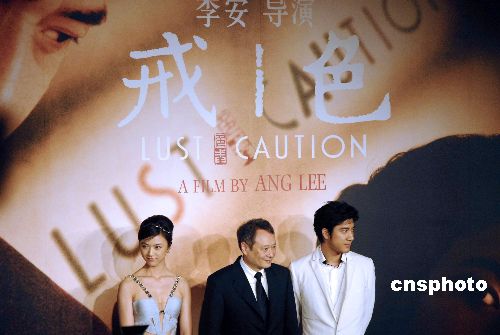 十月三十一日晚,《色,戒》在上海啟動(dòng)內(nèi)地上映,導(dǎo)演李安(中)和主演湯唯(左)、王力宏出席儀式。 該影片已經(jīng)在中國(guó)香港和臺(tái)灣地區(qū)創(chuàng)造了新的票房紀(jì)錄。中新社發(fā) 曹子琛 攝