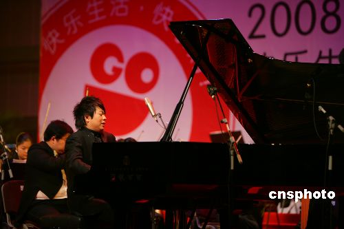12月28日晚,青年鋼琴演奏家郎朗在長(zhǎng)沙舉行“快樂生活快樂購(gòu)·郎朗乾坤2008新年感恩鋼琴音樂會(huì)”。上半場(chǎng)郎朗和湖南省交響樂團(tuán)合作表演了《黃河》,下半場(chǎng)獨(dú)奏時(shí)間里,郎朗演奏了莫扎特降B大調(diào)鋼琴奏鳴曲等世界名曲。中新社發(fā) 鄧霞 攝