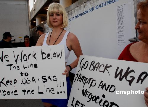 第65屆金球獎頒獎典禮當地時間一月十三日被迫在美國洛杉磯比佛利山希爾頓酒店改為記者出席的新聞發(fā)布會,創(chuàng)歷史的沒有紅地毯,毫無好萊塢星光,卻有罷工的美國編劇協(xié)會在現場抗議示威。