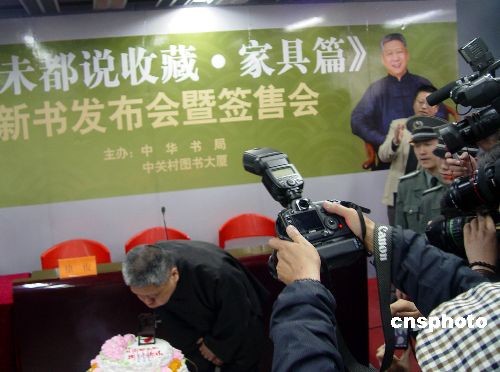 三月二十二日,著名收藏家、鑒定家馬未都在北京簽售其新書《馬未都說收藏·家具篇》。他在中央電視臺(tái)“百家講壇”對(duì)收藏文化的另類解讀,在短時(shí)間內(nèi)積聚了很高的人氣,成為繼易中天、于丹之后的又一位大眾文化偶像。當(dāng)天是馬未都53歲的生日,他在簽售現(xiàn)場吹滅生日蛋糕上的蠟燭,有趣的是在蛋糕上佇立著一個(gè)巧克力做的古色古香的老式座椅。中新社發(fā) 應(yīng)妮 攝