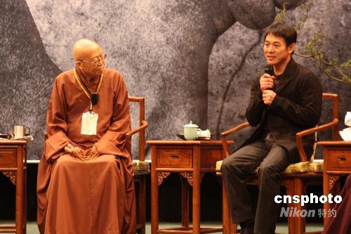 六月一日下午,臺灣法鼓山文教基金會在臺北市舉辦“重建希望——從四川震災談起座談會”。影星李連杰(右)與法鼓山創(chuàng)辦人圣嚴法師,在座談會上交流救助四川地震受災民眾的體會。中新社發(fā) 耿軍 攝