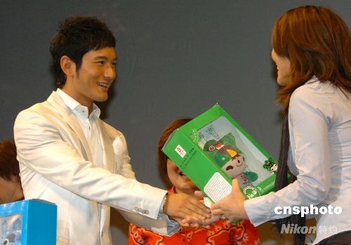 8月29日晚,中國內(nèi)地當紅小生黃曉明在東京的時尚中心澀谷舉行影迷見面會,吸引了一千八百多位中日兩國的“黃迷”前往。其主演的電視劇《新上海灘》正在日本各地熱播,人氣急劇上升,擁有了大量粉絲。黃曉明表示,此次見面會的部分門票收入將捐贈給中國四川和日本東北地震災區(qū)。圖為黃曉明在見面會上向影迷贈送奧運福娃。中新社發(fā) 朱沿華 攝