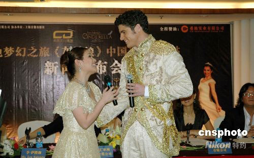 美國百老匯歷史上最著名的音樂劇之一《灰姑娘》,即將進(jìn)行中國巡演上海站的演出,助陣二00八中國上海國際藝術(shù)節(jié)。九月六日,該劇主演穿著舞臺上的華美服飾,在新聞發(fā)布會上即興演繹劇中舒緩的情歌,為上海之行造勢。中新社發(fā) 南星 攝