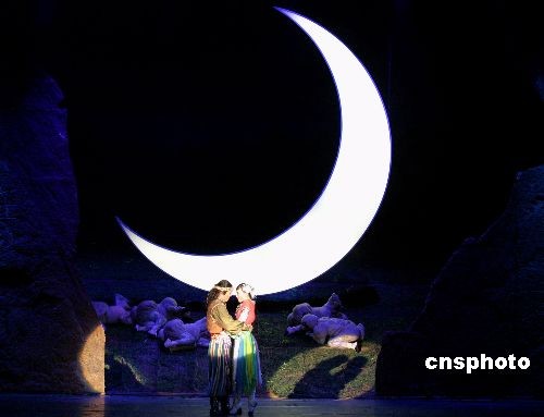 2008年11月7日晚,由寧夏銀川藝術劇院創(chuàng)作的中國第一部大型原創(chuàng)回族舞劇《月上賀蘭》在福州進行專場慰問演出。舞劇反映了在千百年前的古絲綢之路上,一支來自西域的商隊歷經(jīng)艱險,在當?shù)貪h族及其他少數(shù)民族的幫助下,戰(zhàn)勝各種困難,完成了穿越沙漠、東渡黃河的商旅使命。在這一過程中,來自西域的青年納蘇與漢地姑娘海真相互愛慕,產(chǎn)生了真摯的愛情。也正是這種真愛,超越了民族、信仰、習俗的界限,使這一對戀人在賀蘭山下結為夫婦,繁衍生息。舞劇以其曲折的劇情、優(yōu)美的舞姿、豪華的燈光和富有真實感的布景,贏得了觀眾的高度贊揚。中新社發(fā) 汪虎 攝
