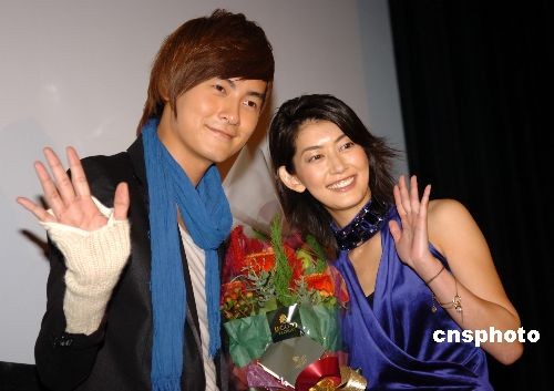 11月18日,臺(tái)灣人氣小生鄭元暢在東京助陣日本版《惡作劇之吻》的DVD發(fā)賣,并首次與日版“相原琴子”的扮演者佐藤蘭子碰面。二人本別披露各自的拍攝內(nèi)幕,令現(xiàn)場近二百名粉絲大笑不已。圖為鄭元暢與佐藤蘭子在活動(dòng)現(xiàn)場向合影。中新社發(fā) 朱沿華 攝