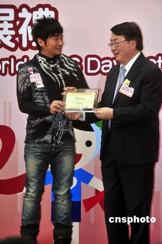十二月一日是世界艾滋病日,著名歌星孫耀威(左)在香港“2008年世界艾滋病日”活動(dòng)開(kāi)展禮上,受到衛(wèi)生署署長(zhǎng)林秉恩的致謝。中新社發(fā) 譚達(dá)明 攝