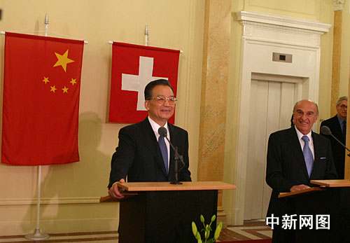 正在瑞士進行正式訪問的中國總理溫家寶,當?shù)貢r間二十七日晚在伯爾尼與瑞士聯(lián)邦主席梅爾茨(右)舉行會談,并共同會見記者。雙方對會談成果給予積極評價。中新網(wǎng)記者 張朔 攝