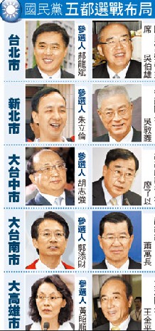據(jù)了解,黨中央規(guī)劃的陣容,大高雄市由王金平出任,臺(tái)北市由吳伯雄擔(dān)任,新北市交給吳敦義負(fù)責(zé),大臺(tái)中市是由曾任臺(tái)中縣長(zhǎng)的廖了以擔(dān)綱,大臺(tái)南市則由出身嘉義市的蕭萬(wàn)長(zhǎng)出馬。